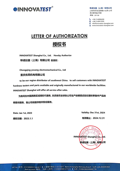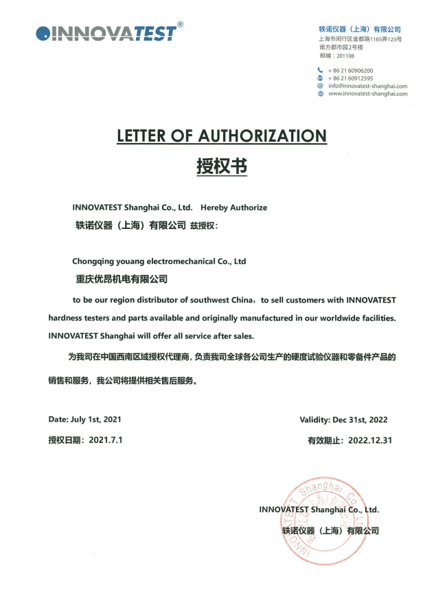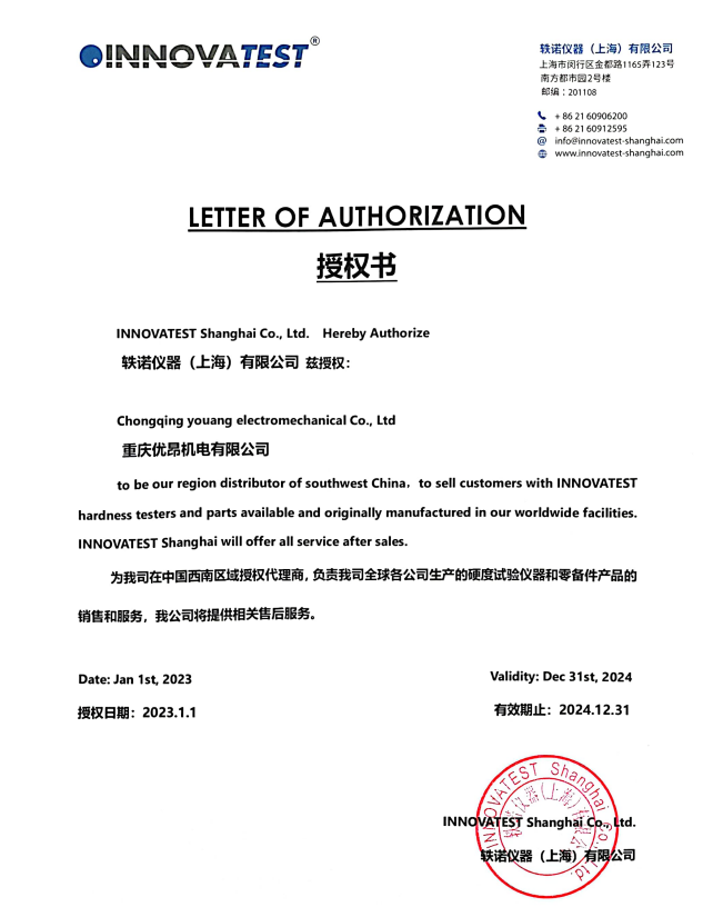• 荷蘭INNOVATEST硬度度2021-2022年授權(quán)書